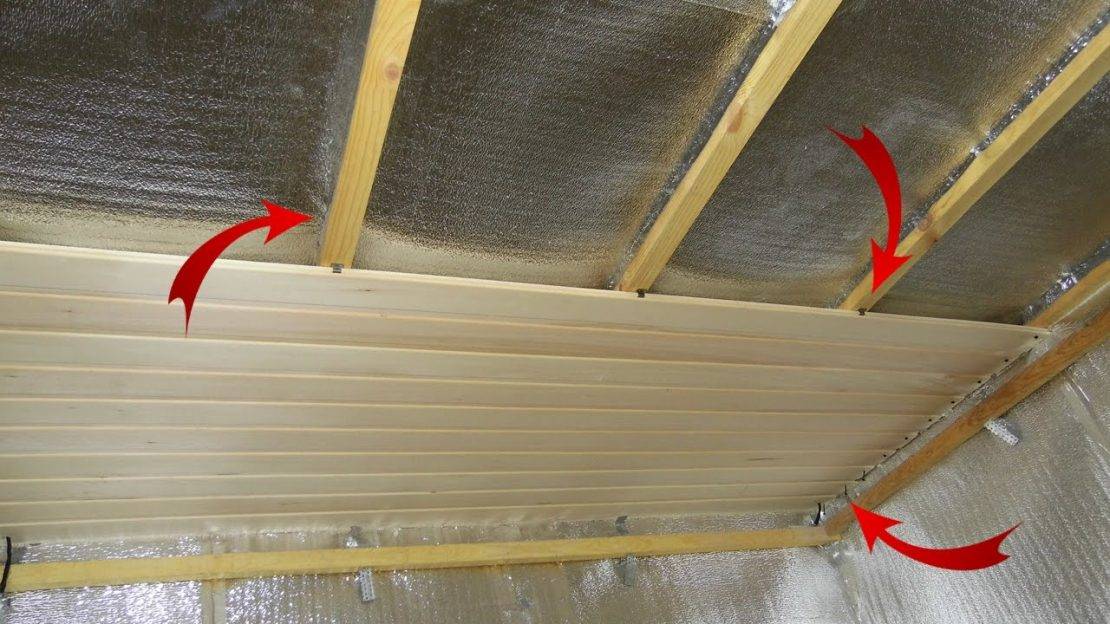 Теплоизолятор без клеящей основы монтируется между двумя обрешетками. Причем утеплитель укладывается в два слоя – первый закрепляется непосредственно на основном потолке, после этого монтируется обрешетка с заложенным в ее ячейки другим теплоизоляционным материалом, а потом снизу к обрешетке крепится еще один слой пенофола или изолона. Далее следует еще одна обрешетка для создания воздушной прослойки между утеплителем и отделкой. Этот вентиляционный зазор убережет от скопления конденсата.