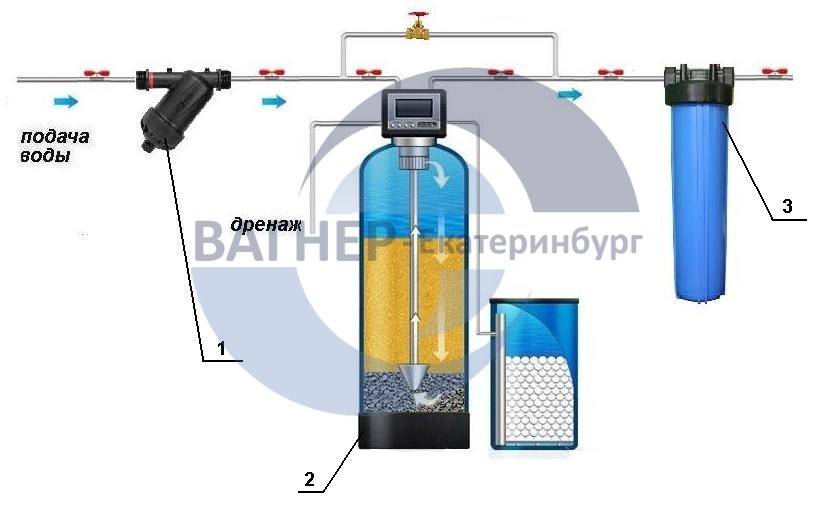 Ионообменный фильтр. Устройство представляет собой колонны с солевыми баками. Каждая вертикальная установка – это резервуар с ионообменной смолой внутри. Проходящая через них вода подлежит умягчению. Предусматривается, что систему можно оснастить емкостью для соли, которая используется в процессе регенерации. После того как достигается критический предел, происходит изменение режима фильтрации на регенерацию и соляной раствор направляется через резервуар. У дорогостоящих систем имеются два контура фильтрации. Один контур задействован в процессе регенерации, в то время как второй функционирует на полную мощность.