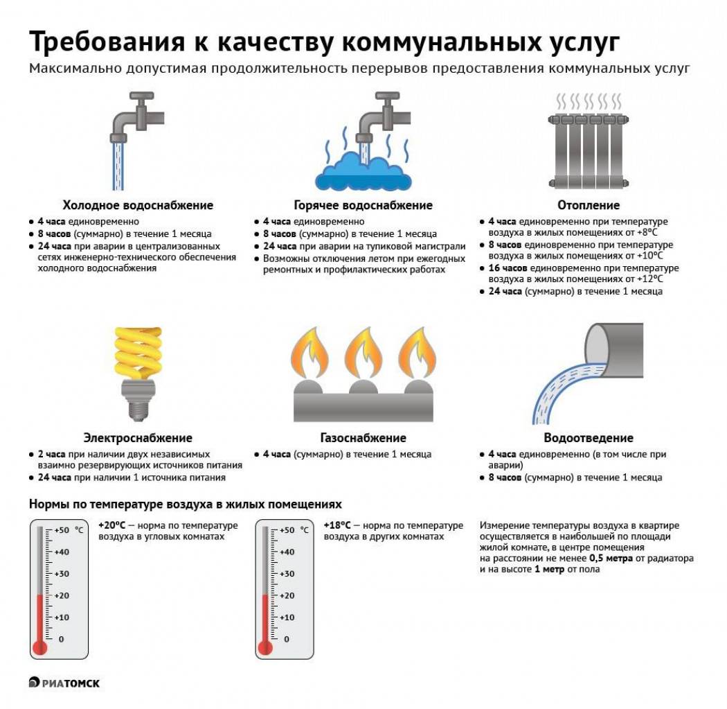 Но есть несколько показателей, падение ниже которых говорит о неисправностях. Это касается обогрева помещений: законом допускается падение температуры до 12, 8 и даже 4 градусов, но лишь на короткий промежуток времени — 16, 8 и 4 часа соответственно.