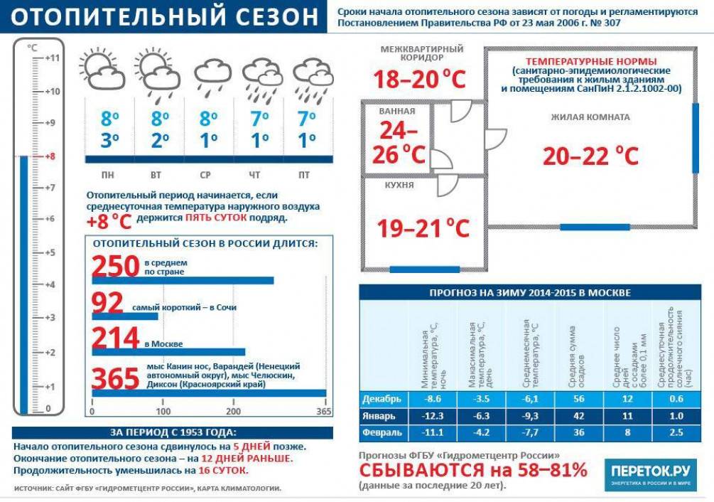 - Период отопительного сезона средних широт начинается с середины октября и заканчивается серединой апреля. В реальности, поставщики услуги должны инициировать начало обогрева с момента, когда будет зарегистрирована среднесуточная температура не выше 8 градусов на протяжении пяти дней подряд.