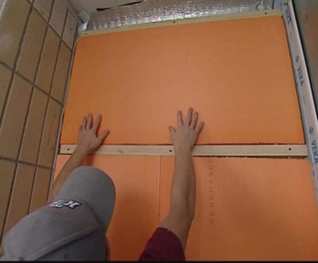Подготовка к работе практически не отличается от наружного варианта утепления. С внутренней стороны отделывать балкон рекомендуется деревянными панелями. Их крепят на обрешетке из бруса, которую монтируют поверх утеплителей.