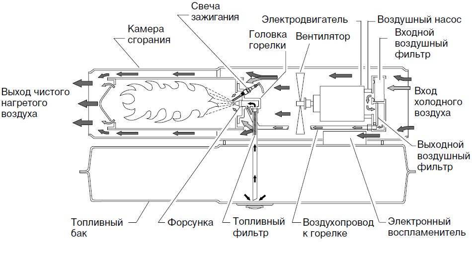 Корпус запрещено устанавливать прямо на бак. Его необходимо приподнять над ним хотя бы на 15-20 см. Между баком и корпусом ставят топливный фильтр. Далее выводят металлическую трубку из топливного бака. Ее подсоединяют к фильтру. Подкачиваемое через насос дизельное топливо, проходя по трубке и через фильтр, попадет в форсунку и воспламенится. Непосредственно процесс горения проводится в камере сгорания, в металлической толстой трубе, меньшей в половину в сравнении с диаметром корпуса, закрепленной жестко в центре корпуса и имеющей для вывода продуктов горения вертикальный отвод.