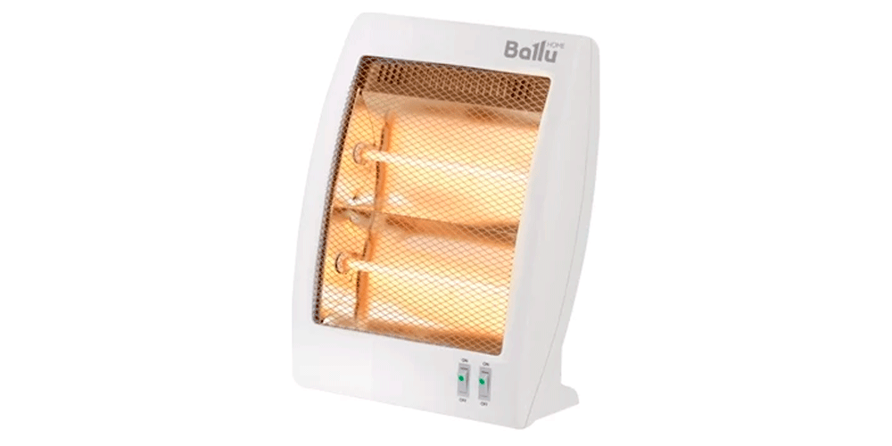 Четвёртое место занимает Ballu BHH/M-09N. Это напольный обогреватель. Внешний вид прибора нейтральный, поэтому он впишется в любое помещение. Корпус из пластика в белом цвете. Две галогенные лампы прикрыты защитной решёткой. Обогреватель обладает защитой от перегрева и опрокидывания. Механическое управление здесь с помощью двух кнопок: каждая отвечает за одну лампу. Мощность нагрева – 400 и 800 Вт. Эффективен для помещения до 14 м². Всего здесь три положения переключателя, которые регулируют среднюю, максимальную мощность и выключают устройство. Это удобно и предоставляет больше возможностей в выборе температуры.
