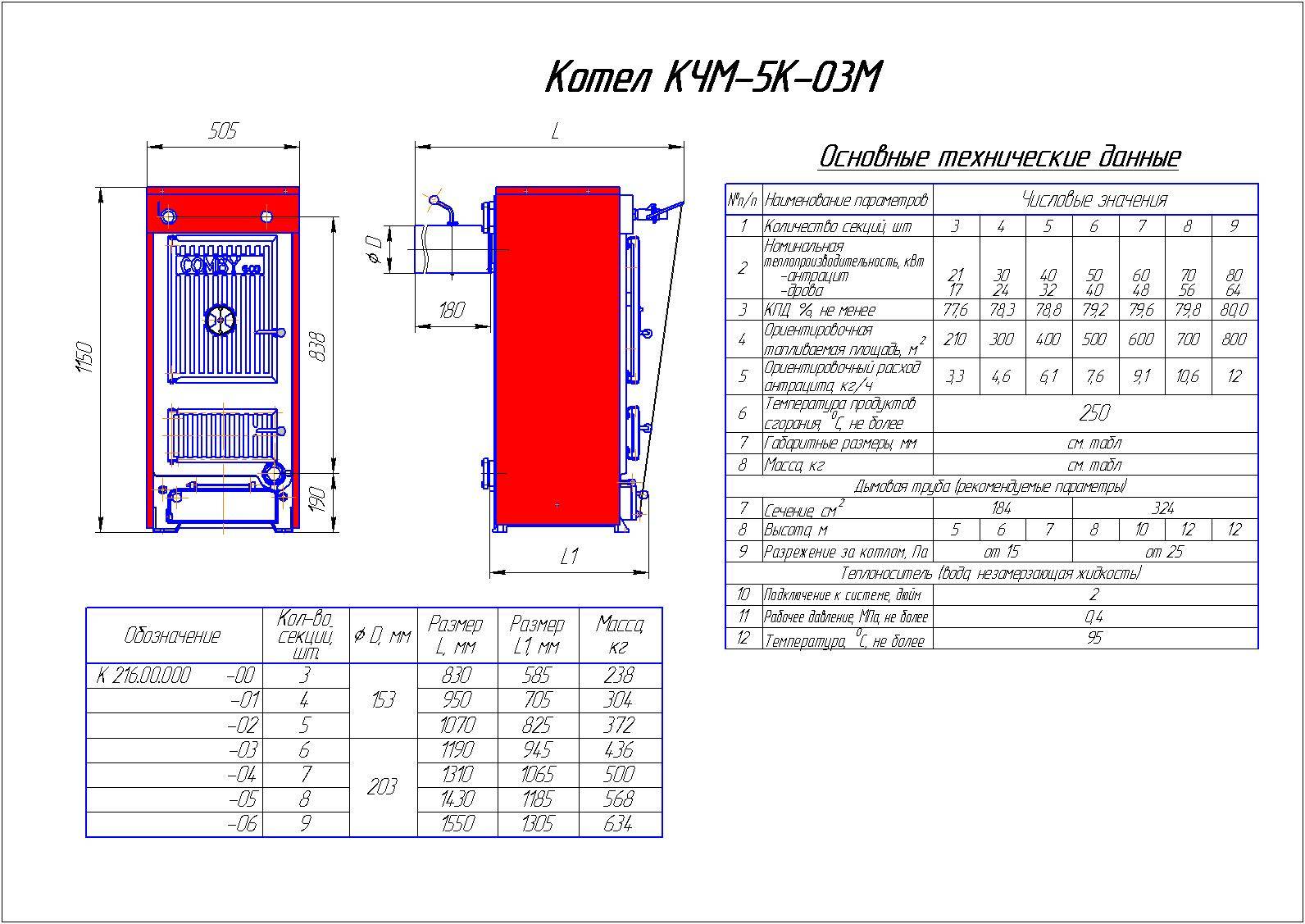 Котел КЧМ-5, как уже отмечалось выше, изготавливается из чугунных секций. К задней секции, в ее верхней части, крепится дымоход. Там же размещен фланец для воды, идущей на отопление. На передней части находятся люк для чистки дымохода, а также несколько дверок (зольниковая, шуровочная, загрузочная). Через них закладывается топливо, очищается зольник.