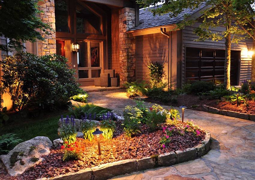 Пример освещения участка дома с помощью светильников на солнечной батарее