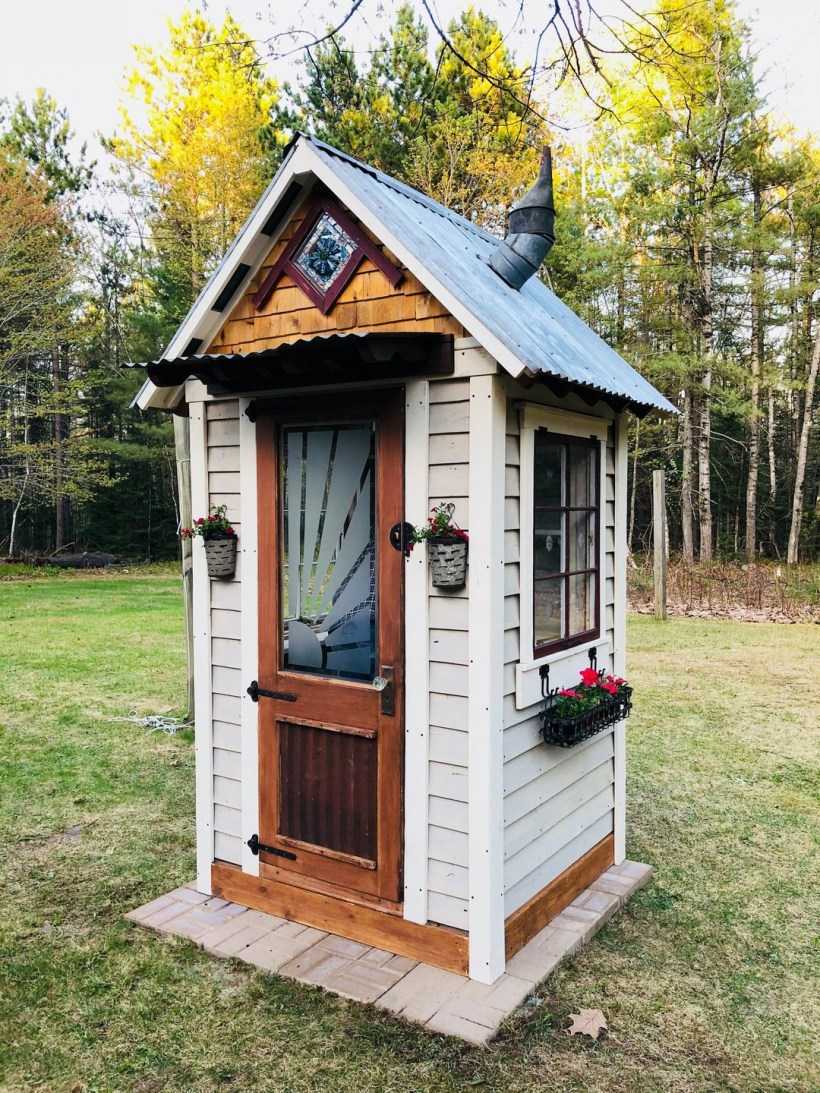 Избушка — самая сложная архитектурная форма дачного туалета. Потребует от вас изрядного количества материалов. Сэкономить на них точно не получится, так как требует большого количества подрезки. Зато полученная граненая форма позволяет сохранить тепло в холодное время года и справиться с неблагоприятными климатическими условиями. Популярность избушки как варианта дачного туалета обусловлена большим количеством дизайнерских вариаций, позволяющих вписать постройку в интерьер любого участка. Многие называют этот вид дачного домика иначе — теремок.