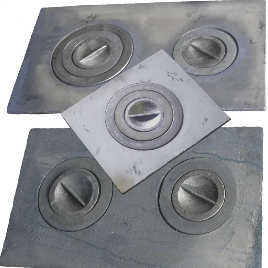 Это цельнолитой лист металла толщиной не менее 8 мм. В нем могут быть оборудованы конфорки фиксированного размера (углубления или выступы в местах приготовления пищи). Глухие плиты выемок не имеют. Варочные поверхности такого типа самые простые в установке и имеют невысокую стоимость, поэтому очень популярны в недорогих печах.