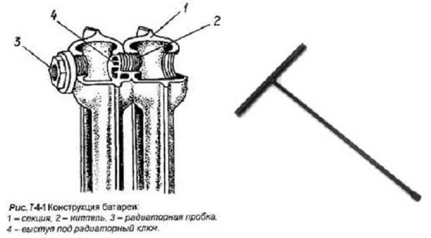 Радиаторный ключ Теперь, пришло время узнать, как правильно отсоединить секцию, у чугунной батареи отопления. Для этого, нам понадобится специальный сантехнический инструмент – радиаторный ключ. В магазине, подобный слесарный инвентарь, не встретишь, но можно сделать самому, взять напрокат, в специализированном сервисе или у знакомого слесаря-сантехника. Инструмент специфический и индивидуальный, является самодельным приспособлением. Как правило, встретить двух одинаковых радиаторных ключей, не реально. Единственное их сходство – это, прямоугольный наконечник, 40 на 24 мм. Обычно, такой наконечник, приваривают к арматуре или трубе, диаметром 15-20 мм и длиной 60-80 сантиметров. С другой стороны, делают специальное ушко, чтобы была возможность вставить, для рычага, монтировку или длинный вороток.