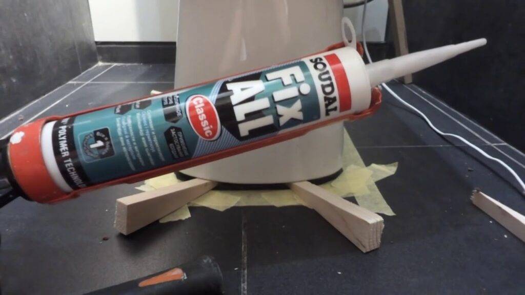 В данном случае, чтобы выставить унитаз по уровню используются деревянные клинья.