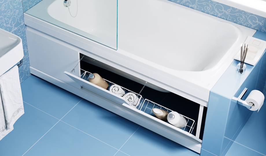 Каркас и панели — главные детали изделия. Исполняются в 2 вариантах: глухом и с дверками, открывающими доступ к коммуникациям и предметам, которые хранятся под ванной. Модели с красивым дизайном органично дополняют интерьер, если оформление в таком же стиле или однотонное.