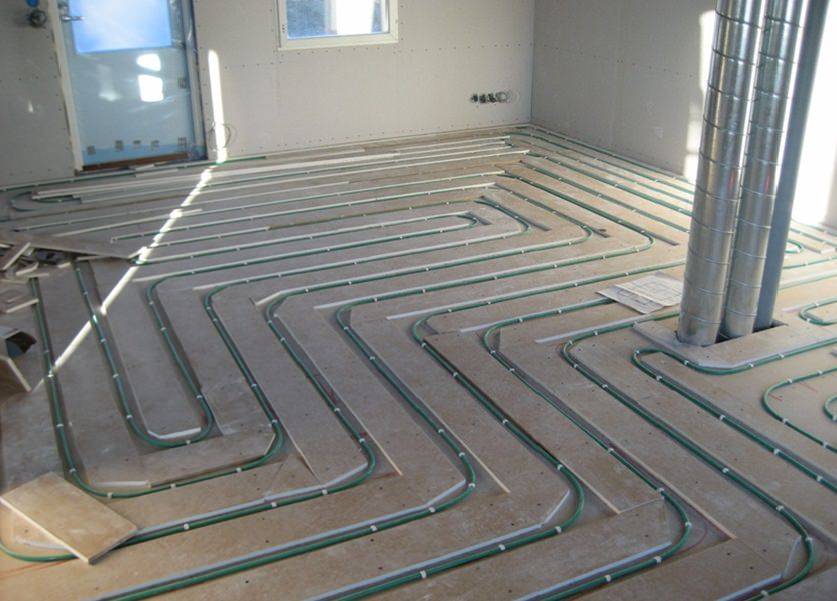 - Сверху устанавливают либо листы ДСП с уже готовыми пазами для труб, либо кладут влагостойкую фанеру, которая будет основанием для монтажа пенополистирольных матов.