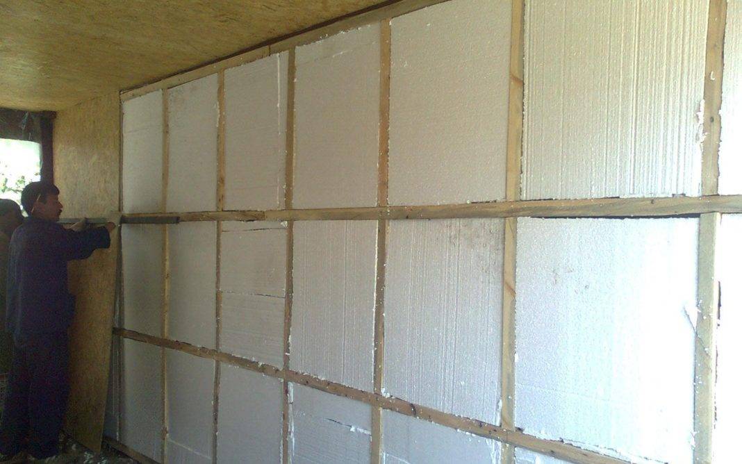 На стены устанавливается заранее подготовленная обрешетка, в которую будет помещать пенопласт. Для обрешетки лучше использовать деревянный брус. Его толщина равна толщине утеплителя. Но необходимо помнить, что дерево не обладает огнестойкостью.