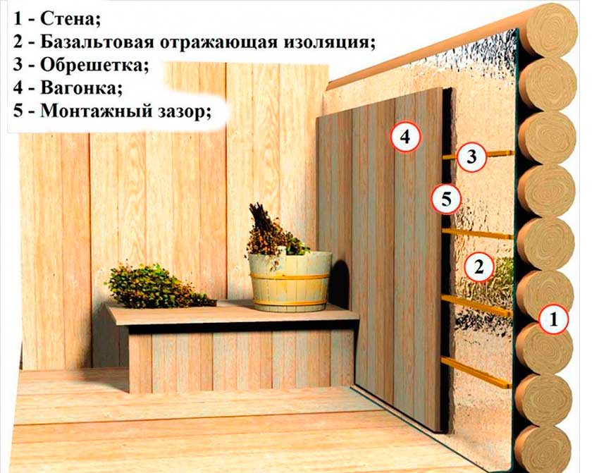 Стены. При утеплении стен сауны изнутри своими руками стоит создать там хорошую вентиляцию.
