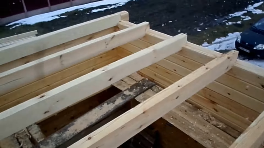 3. Снизу к балкам прибивают обрешетку из реек с минимальным сечением 20 х 90 мм, располагая их в перпендикулярном направлении с шагом 0,6 м.