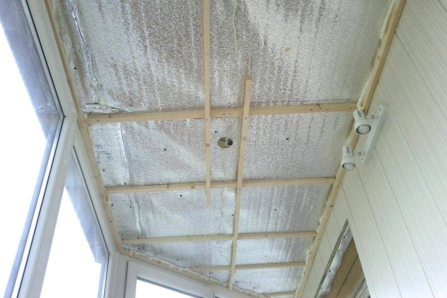 Металлизированное покрытие должно быть направлено в сторону финишной отделки. Если было произведено утепление потолка на балконе или лоджии другим материалом, то пенофол настилается вместо пароизоляции. Герметичность обеспечивается проклеиванием стыков специальным алюминиевым скотчем. При этом исключается образование нахлест.