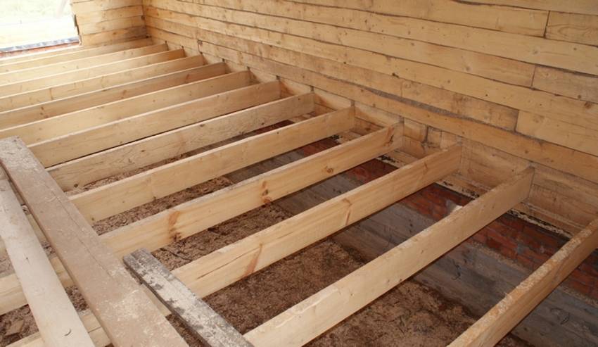 - между деревянными лагами прокладывается утеплитель. В зависимости от используемого материала толщина этого слоя может быть разной. В любом случае она не должна превышать размеров самих лаг;