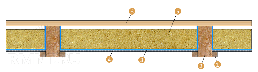1 — черепной брусок; 2 — лага пола; 3 — сетка; 4 — пароизоляция; 5 — утеплитель; 6 — доска пола