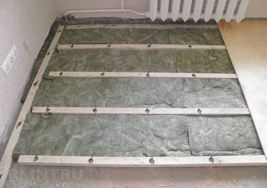 - Чтобы утеплить пол, между лаг можно уложить слой минеральной ваты или пенополистирола. Также минеральная вата дает и шумоизоляционный эффект. В отличие от бетонной стяжки, тут не обязательно использовать утеплители с высокой плотностью, так как на них не будет нагрузки.