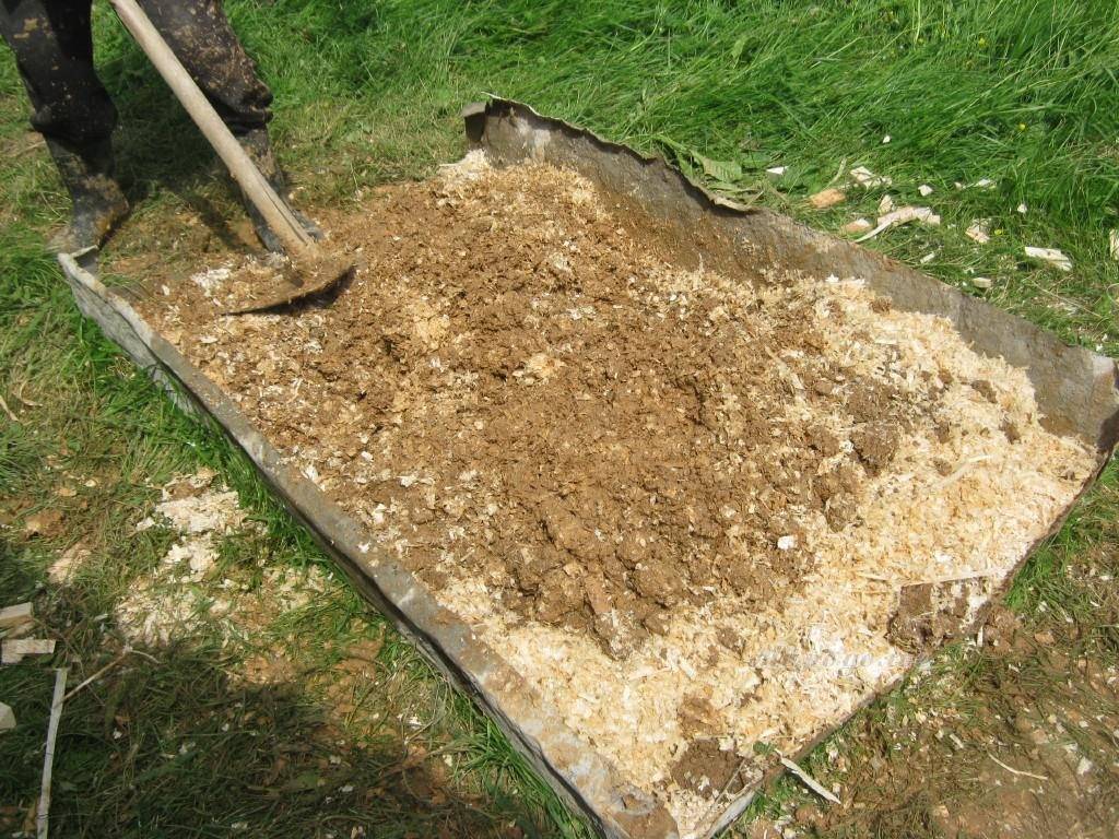 - Известь перемешивают с опилками и добавляют в глиняный раствор. Тщательно смешивают все компоненты, подсыпая время от времени очередную порцию древесного сырья.