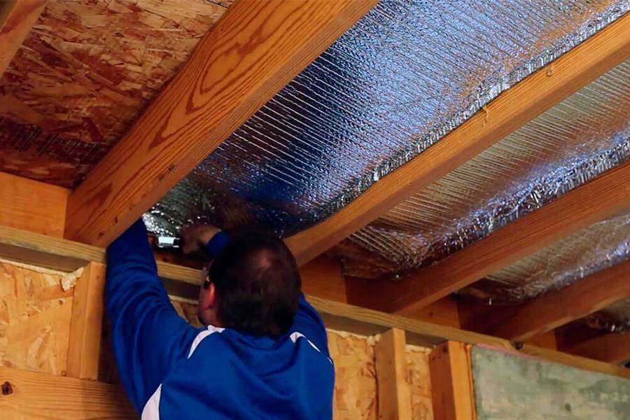 - Следующим слоем укладывают фольгу, которая защитит утеплитель от влаги и будет отражать тепловое излучение. Стыки заклеивают алюминиевым скотчем.