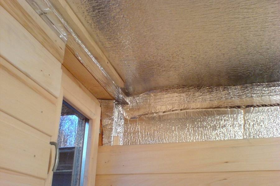 Выполняется отделка потолка в бане с обшивкой фольгированным материалом. Сначала на черновой потолок крепят рейки толщиной 40-50 мм. Фольгированную пароизоляцию пристреливают степлером. Стыки склеивают алюминиевым скотчем.