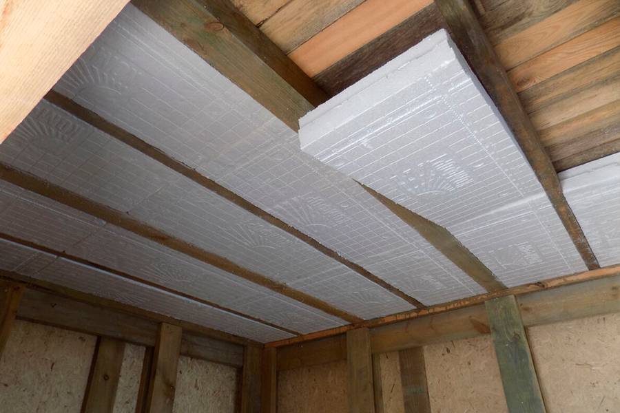 Утепленный Пенофолом потолок в бане с отверстием под печную трубу
