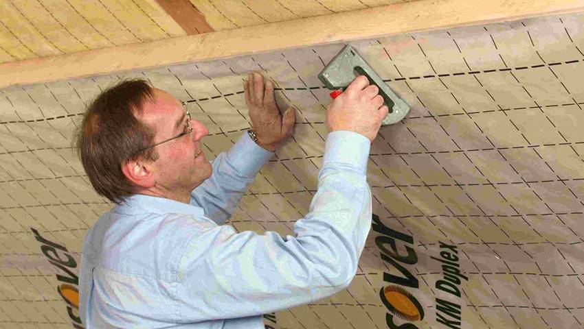- Пароизоляция чердачного перекрытия по деревянным балкам — крепится с помощью строительного степлера снизу к черновому потолку (обрешетке), что позволяет отсекать пары от всей конструкции перекрытия. Необходимо делать перехлесты рулонов пароизоляции не менее 15-20см и тщательно их проклеивать алюминиевой клейкой лентой. Обязательно формировать напуски на стены 15-20см и тщательно их проклеивать (заводить под штукатурку и другую отделку стен). Тщательно герметизировать места прохождения через чердачное перекрытие дымоходных, вентиляционных труб и других инженерных коммуникаций с помощью специальных рукавов. Наилучший материал в качестве пароизоляции — это полиэтиленовая плёнка высокой плотности от 200г/м² и выше.