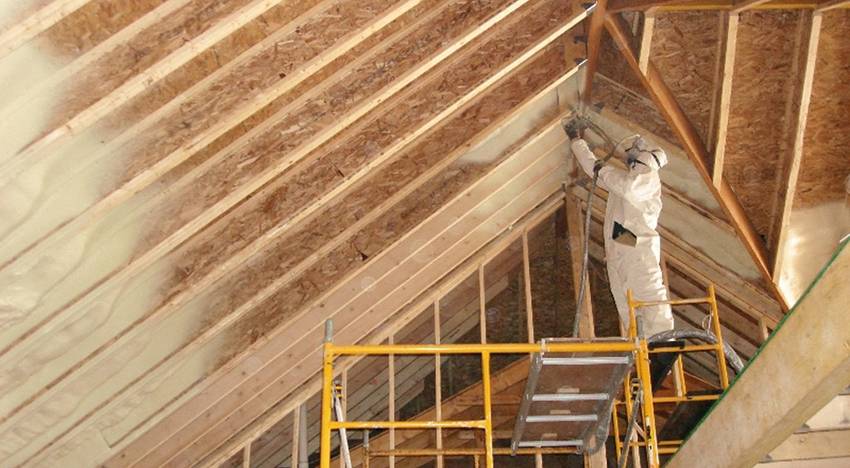 Другие способы создания теплосберегающих конструкций также можно рассматривать, но, по своим параметрам они уступают названным или стоят значительно дороже. К наиболее дорогим вариантам теплоизоляции относится набирающий популярность напыляемый пенополиуретан. Однако, технология его нанесения требует наличия специального оборудования и определённых навыков обращения с ним. Поэтому, произвести утепление потолка каркасного дома таким способом, самостоятельно не получится.