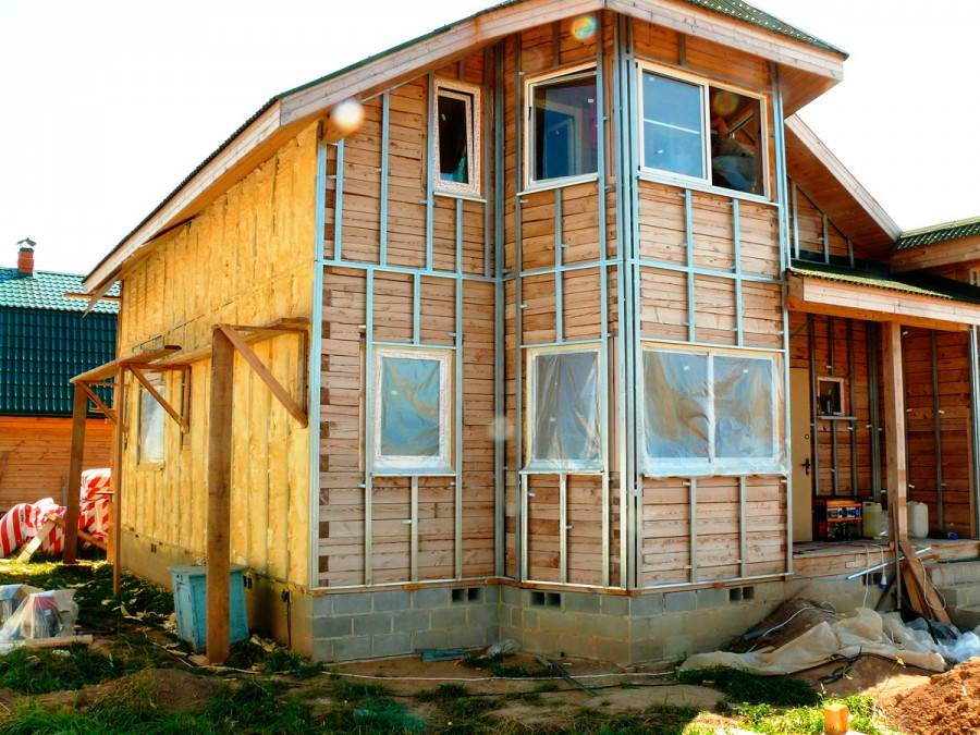 На них в поперечнике прибивают бруски дополнительной обрешетки, между которыми вкладывают плиты материала и крепят к брускам нижней обрешетки. Щели заполняют пеной. В результате чего должна получиться ровная поверхность.Этот вариант в большинстве случаев используют для устройства мокрого фасада по следующим действиям: на все углы здания устанавливаются уголки с сеткой, которые закрепляются клеем. На остальную поверхность закрепляется широкая сетка в рулонах, которую укладываю внахлест на клеевую массу. Угловая сетка должна утонуть в клее. Закрепив ее на пенополистероле, по ней проводят шпателем от центра к краям, тем самым удаляют лишний клей.Когда клей высохнет, стену необходимо покрыть грунтовкой, на которую хорошо ложится штукатурка.