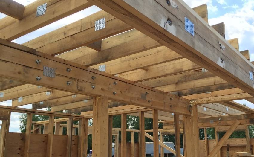 Установка несущих балок чаще всего производится на этапе возведения стен здания. Перед укладкой несущих брусьев их поверхность обрабатывается всеми необходимыми пропитками.
