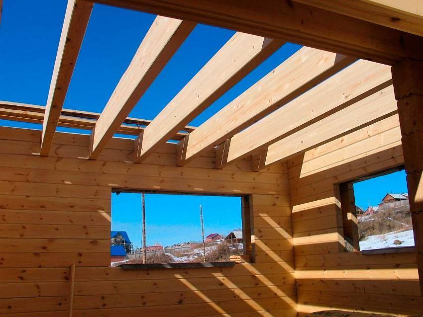 Монтаж несущих брусьев начинают от двух крайних стен, при этом балки должны располагаться на расстоянии 5 – 10 см. После установки двух крайних брусьев монтируем остальные, соблюдая необходимый интервал.