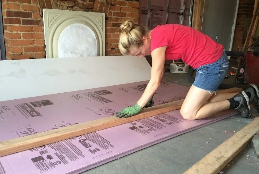- Экструдированный пенополистирол. В отличие от обычного пенопласта имеет высокую плотность и не прогибается под весом человека или мебели. Листы могут иметь толщину от 20 до 50 мм, подбирать лучше плиты потоньше, чтобы сильно не поднимать уровень. Есть пазы, за счет которых листы легко стыковать, края срезаются ножовкой по металлу. Для надежности стыки проклеивают фольгированным скотчем.