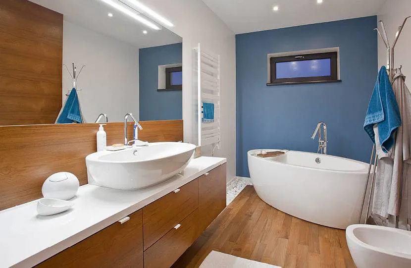 Важно отметить, что в ванной комнате лучше всего работают влагостойкие материалы, например, доски из экзотических пород дерева, которые дополнительно защищены специальной масляной пропиткой. Препарат проникает в древесину, образуя водонепроницаемый слой, который препятствует проникновению воды