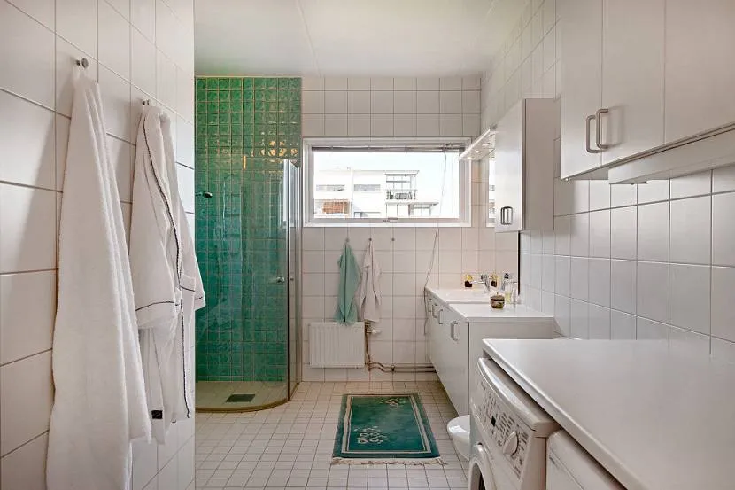 Голубой приглушенный, белый не режет глаз и приближен к молочному цвету, а коричневый часто выполняется в виде деревянных поверхностей. Дизайн ванной комнаты в скандинавском стиле может быть в трех оттенках: белый, бежевый и серо-голубой. Здесь никогда не применяют радикального контраста. На белом фоне выгодно смотрятся комнатные цветы, коих должно быть небольшое количество, а также полотенца, халат, принадлежности для умывания.