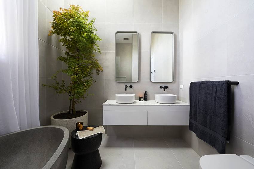 Этот стиль использует простые формы, поэтому, отличная идея – это оборудовать минимализм для ванной комнаты.