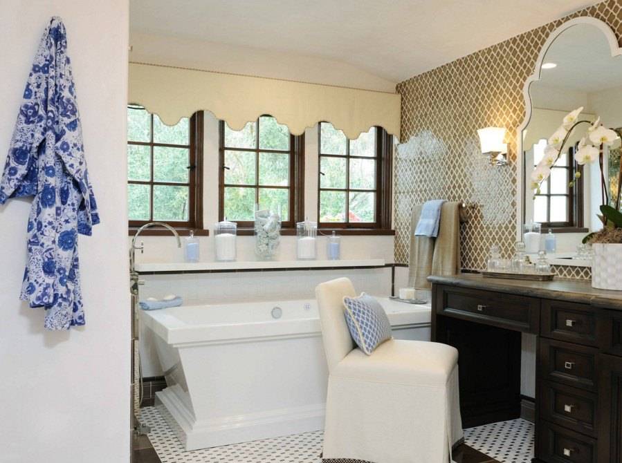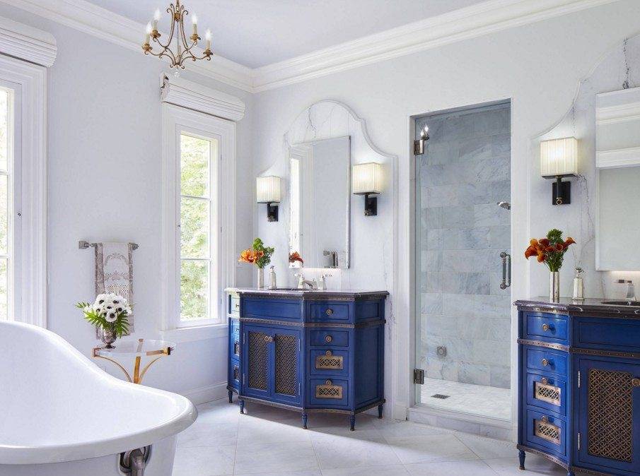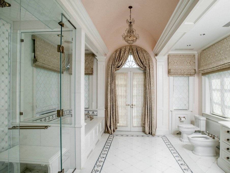 Уникальная и утонченная атмосфера ванной комнаты в этом удивительном стиле подарит такие детали, как: картины с живописными пейзажами, большие зеркала с антикварными рамами, фарфоровые статуэтки, морские украшения и красивые вазы.