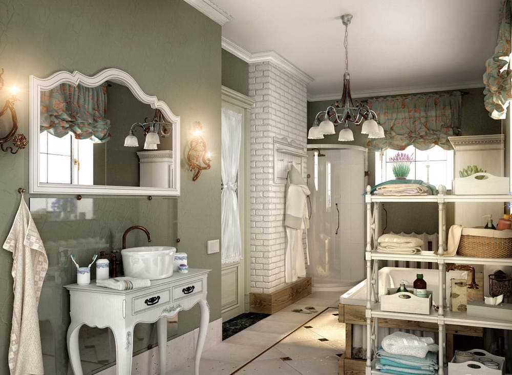 Несмотря на некоторую строгость и «сухость» стиля прованс, в интерьере ванной будут интересно выглядеть необычные цвета. Например, зеленый в сочетании с лимонным или нежно-розовым цветом. Такой союз сделает комнату яркой и свежей. Последним штрихом в этой комнате станет кран и душ, стилизованные под старину.