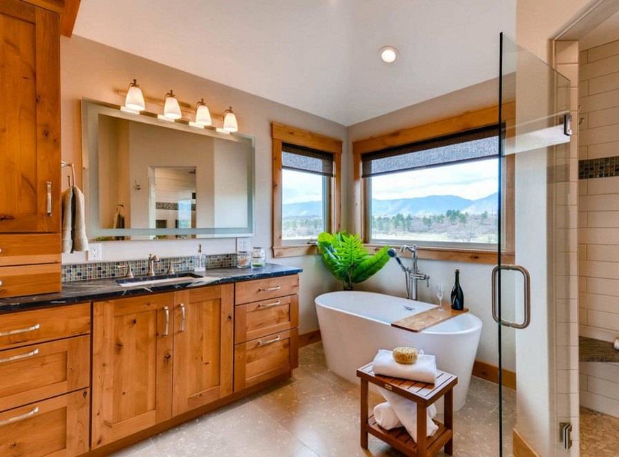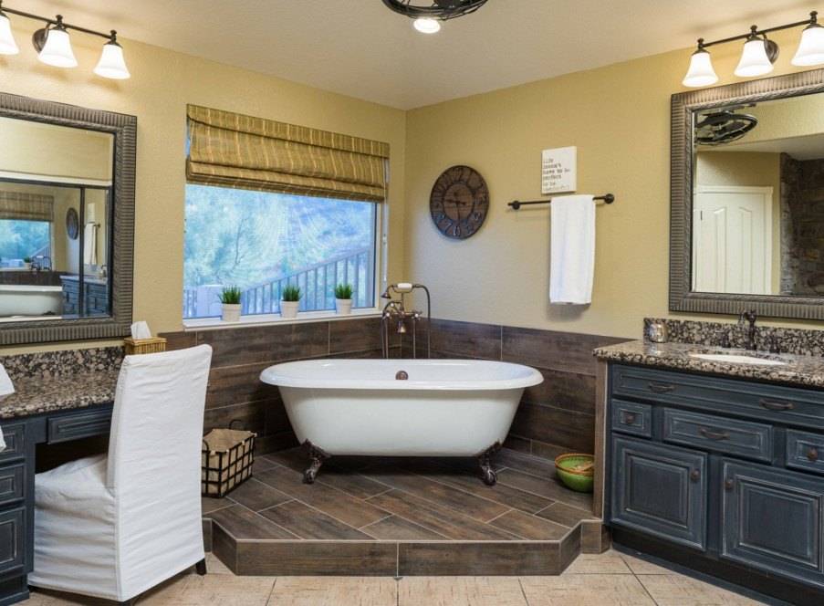 Можно сделать деревянный пол, а вместо штор использовать ставни. Так интерьер будет смотреться особенно колоритно и по-деревенски. Если позволяет пространство, то можно поставить кованый столик около ванны.