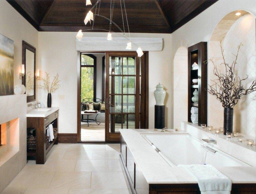 Чудесным украшением станет для такой ванной кованая люстра с металлическим или деревянным абажуром. Она же обеспечит и освещение в комнате, которое в данном случае должно быть средней яркости.
