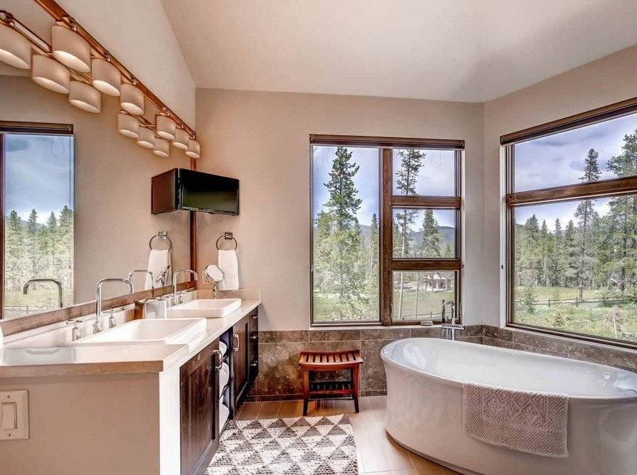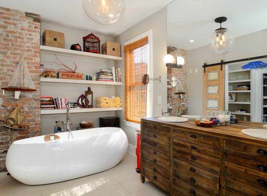 Особое внимание уделяется выбору ванной. Если помещение просторное, в нем устанавливается красивая ванна на изогнутых ножках
