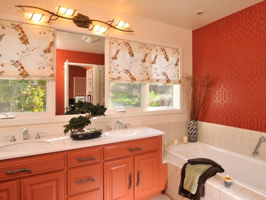Цвета преимущественно светлые, они создадут в ванной уютную, приятную атмосферу. В интерьер необходимо добавлять различные элементы декора, желательно тематические, связанные с природой. Отлично подойдут цветочный орнамент на мебели и тематические аксессуары.