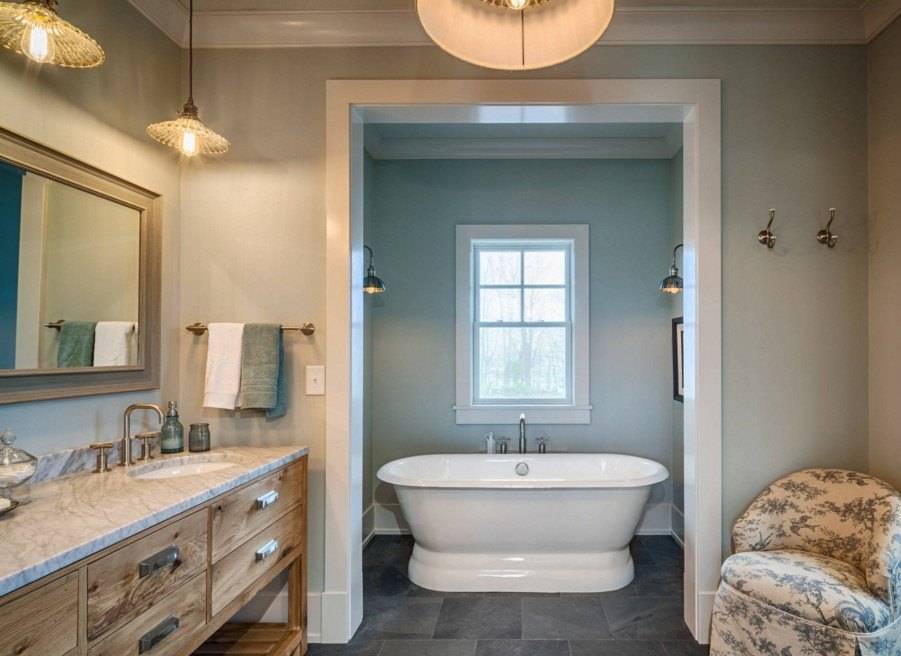 Проблемы с размерами помещения чаще всего возникают в городских квартирах, тогда как ванная комната в доме за городом получится более приближенной к канону стиля прованс.