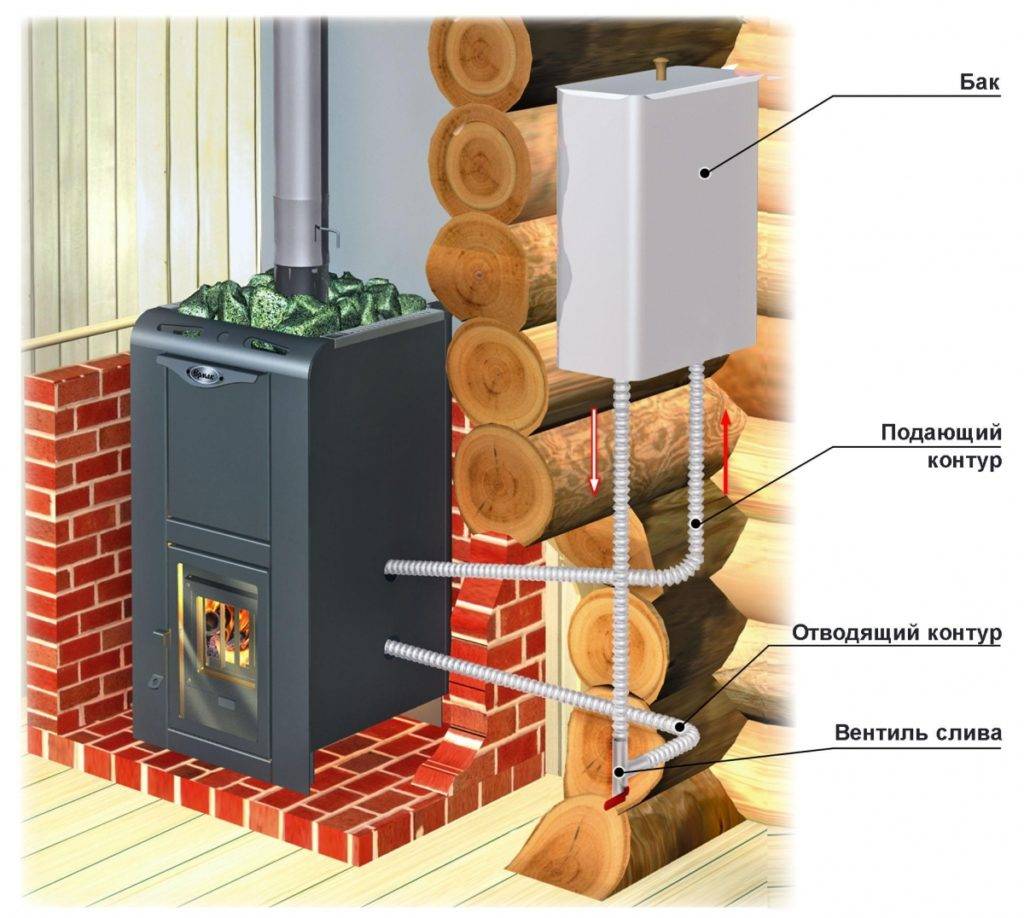 Высокая теплоотдача банных печей, повышенная интенсивность сгорания в них топлива активно используются для размещения в них устройств подогрева воды для проведения помывки.