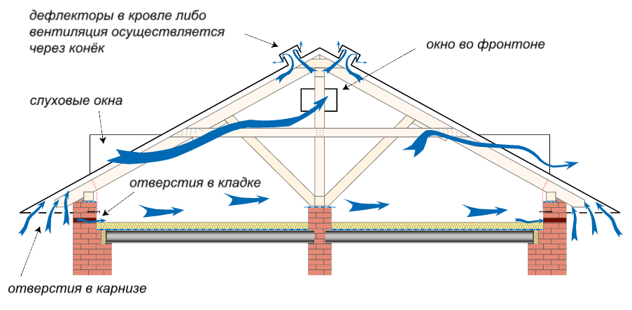 Воздушный поток поступает в чердачное пространство через слуховые окна летом и обрамляющие их зазоры зимой, когда внутри формируется разрежение. Удаляется самопроизвольно, вытесняемый новой порцией, поступающей с улицы.