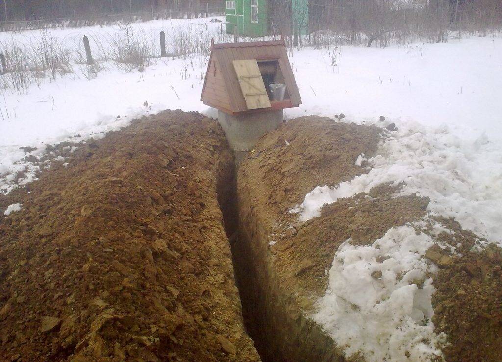 - Вначале следует вырыть траншею для водопроводной трубы ниже точки промерзания грунта – при этом нужно делать небольшой уклон в 3 см на каждый метр линии;