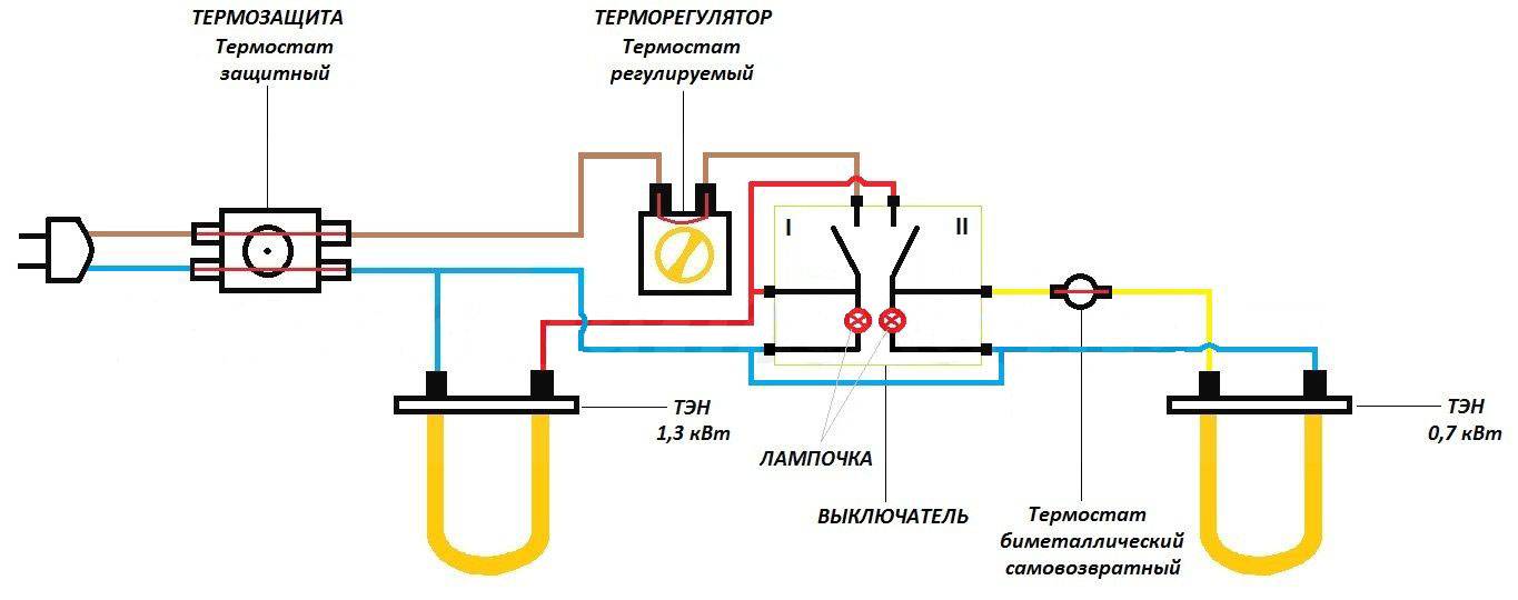 В случае отсутствия мультиметра его можно заменить контрольной лампой. К контактам элемента последовательно подсоединяется контрольная лампа. Если при подаче напряжения она загорается, он исправен, если нет, его необходимо заменить. Аналогично проверяется и термостат.