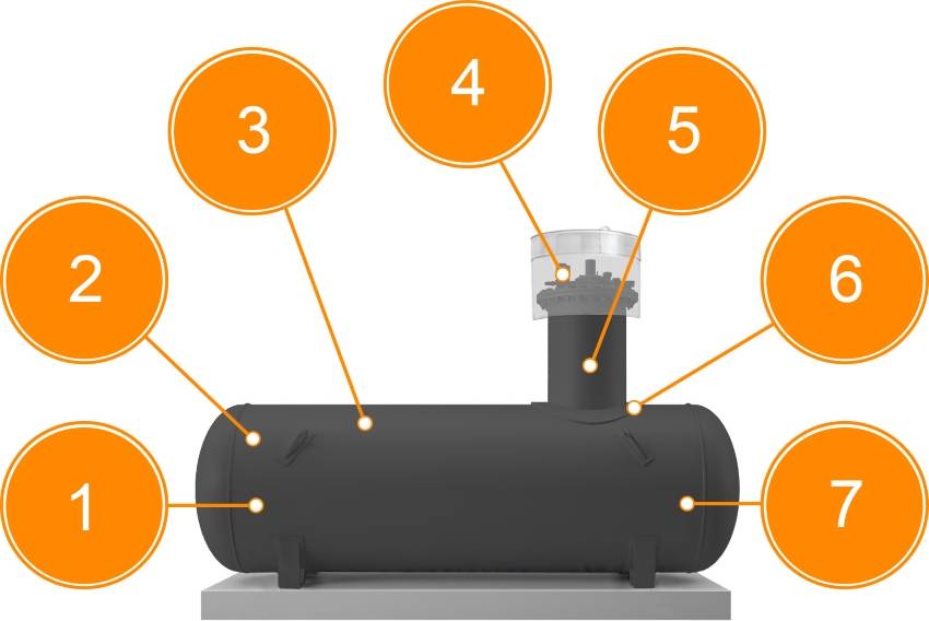 Строение газгольдера: 1 — резервуар с толщиной стенок 8-10 мм, 2 — обмазочная гидроизоляция, 3 — объем бака 1-50 куб.м, 4 — запорно-предохранительная арматура и редуктор, 5 — горловина, 6 — усиливающий воротник горловины, 7 — усиленная защита сварных швов