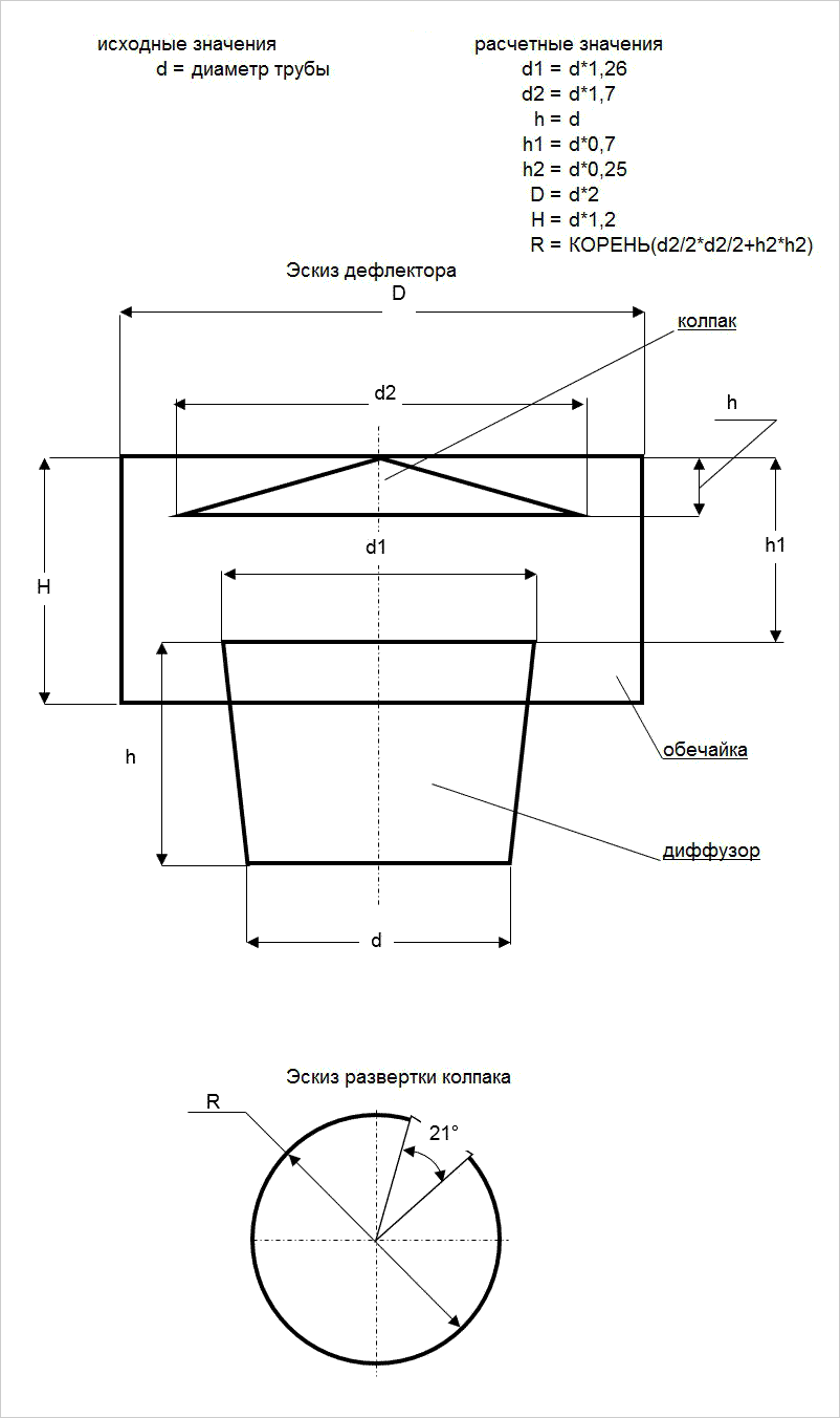 Перед тем как приступить к изготовлению этого элемента, следует составить схему. В дальнейшем действуем строго согласно схеме, при этом одновременно, выдерживаем все размеры. При помощи карандаша рисуем каждую деталь на листе оцинковки. Затем вырезаем и соединяем при помощи заклепок. На конечном этапе крепим дефлектор. Как вы видите, нет ничего сложного, и не стоит прибегать к помощи специалистов.