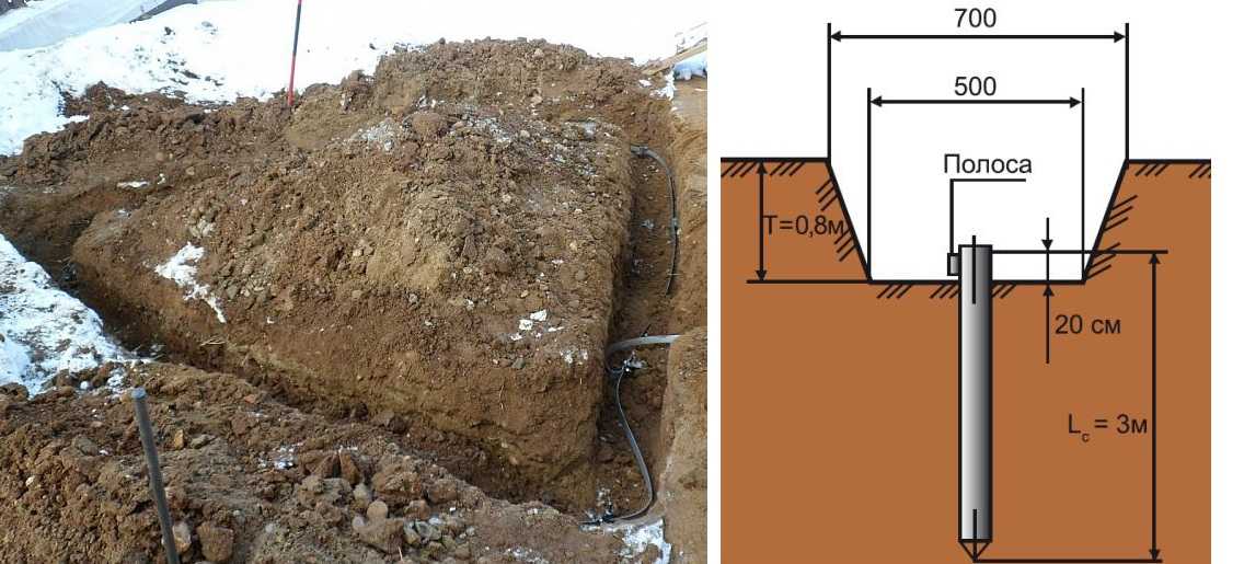 Земляные работы предназначены для созданного в почве равностороннего треугольника контура заземления. Для этого производится рытье ям и соединительных траншей. Глубина траншей и ям должна достигать 1,5 м. Прокладывать контур заземления рекомендуется на расстоянии 1 метр от фундамента частного дома. Траншеи выкапываются по размеченному треугольнику на глубину до 1 м. Ширина траншее должна быть достаточной для проведения последующей сварки электродов.