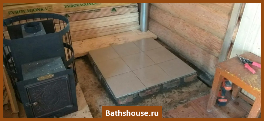 Перед тем как сделать печь, указанные выше значения иногда уменьшают. При этом необходимо позаботиться о специальных защитных экранах с целью безопасного расположения каменки в бане. Перед устройством печи пол покрывают базальтовым картоном, на который сверху необходимо настелить лист металла, выступающего за пределы корпуса каменки минимум на 5 см с каждой стороны. Металлический лист должен служить защитой пола от вылетающих искр из топки.